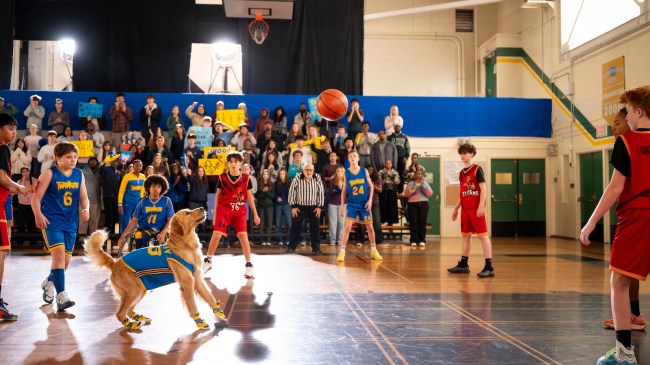 In the 12-minute footage of the film we saw at CinemaCon, the new Buddy walks past a statue of the original Buddy. When Buddy meets a boy in a wheelchair who also lost his parents, they watch an old VHS tape of the original movie together and decide to recruit Buddy to his school’s basketball team. It’s even the same Timberwolves team uniform that Buddy is wearing, and there’s another grumpy clown trying to get Buddy back, and yet another referee saying, “There you go.” still There is no rule that says dogs can’t play basketball. ”