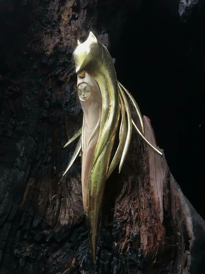 Hawk…The mask is carved with gold leaf and the body is made from roasted hawthorn wood.