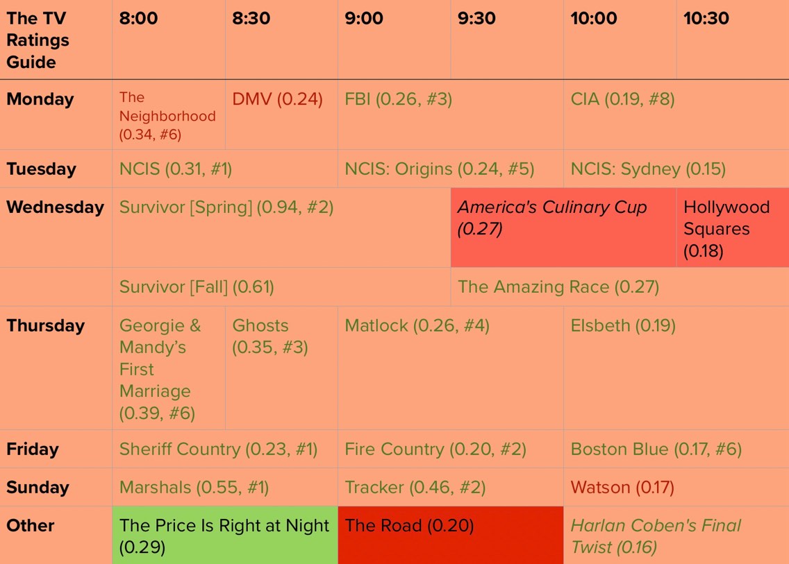 Elsbeth and the FBI: On the surface, the fall schedule appeared to be a big win for Elsbeth and the FBI. Both veteran dramas are set to have their time slots upgraded next season after having fairly low linear ratings this season. Elsbeth is one of CBS’ lowest-watched shows in live and same-day ratings, so moving the show, which relies heavily on delayed viewing, to the 9 p.m. slot is a fairly unusual move. The FBI hasn’t performed as badly as Elsbeth in the linear demo, and has picked up a bit since CIA’s premiere, but for a show partially owned heading into its ninth season, it certainly looked like it would end next year. It’s been compounded by its poor year-over-year trends since its move to Mondays, but now it’s being moved to the 8 p.m. slot, which is the best place to air it on any network, but especially on CBS. So what do these timeslot upgrades actually mean? If there’s not enough improvement to justify these early slots, it could backfire and CBS could choose to cancel these two shows that seemed set up as bubble series for next season anyway. In the case of Elsbeth, CBS may have lacked confidence in Cupertino, who was immediately ordered to series before filming anything. If they had doubts about Cupertino’s potential, maybe they wanted to air together for compatibility but just didn’t want to ruin Elsbeth by airing her behind. If that’s the case, it says more that CBS was worse in Cupertino than that it was necessarily better in Elsbeth. Still, it’s a good sign that they, along with Cupertino, are trying to keep Elsbeth from falling. As for the FBI, they may be planning on extending its run beyond Season 9, but they may just be moving up the FBI/CIA pairing by an hour in preparation for a new CIA series. Next season could feature a new CIA series, as CBS has designated Monday as “CIA Night.” However, it seems more likely that the FBI will stick around next season and beyond than I expected.